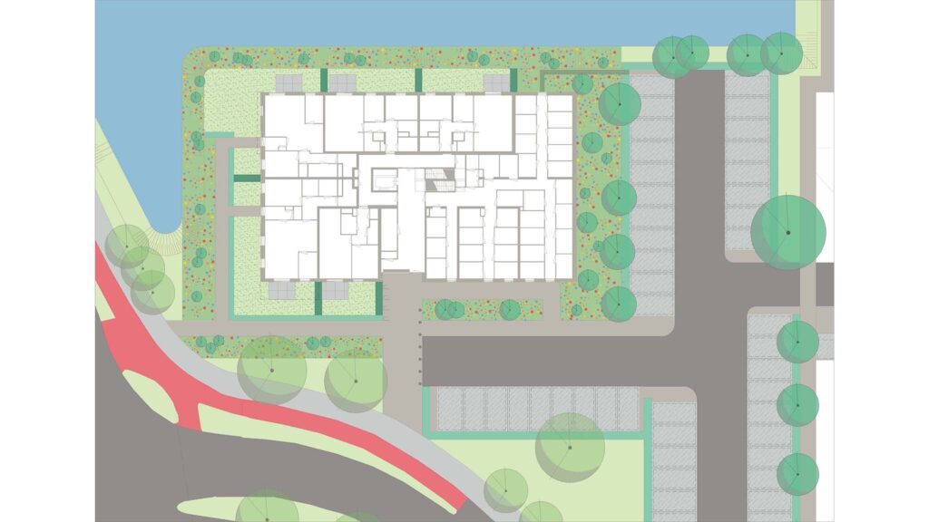 De hoofdentree krijgt een brede, toegankelijke ontsluiting met enkele bezoekersfietsenrekken. Rond de 48 parkeerplaatsen zorgen lage hagen en bomen voor een groene inpassing. Enkele parkeerplaatsen zijn verbreed voor mindervaliden. De kleinere bomen aan de zuidzijde van het appartementencomplex geven maat en schaal aan het gebied en verzorgen een groen filter voor de aan die zijde gelegen appartementen. Bestaande bomen zijn zoveel mogelijk behouden.