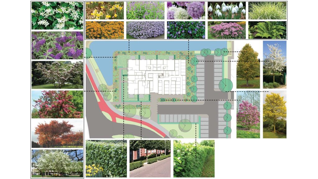 Het appartementencomplex wordt ingepast in bloemrijke borders, opgebouwd uit bodembedekkende beplanting, vaste planten, siergrassen, bollen en knollen. De taluds langs het water zijn beplant met soorten die geschikt zijn voor nattere omstandigheden. Solitaire struiken, soms meerstammig, geven extra structuur in de borders. Aan de noordwest- en noordoostzijde liggen de privétuinen van de appartementen op de begane grond, afgescheiden door groenblijvende hagen.