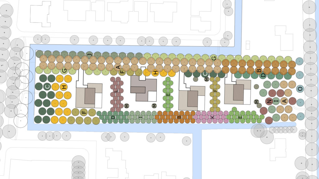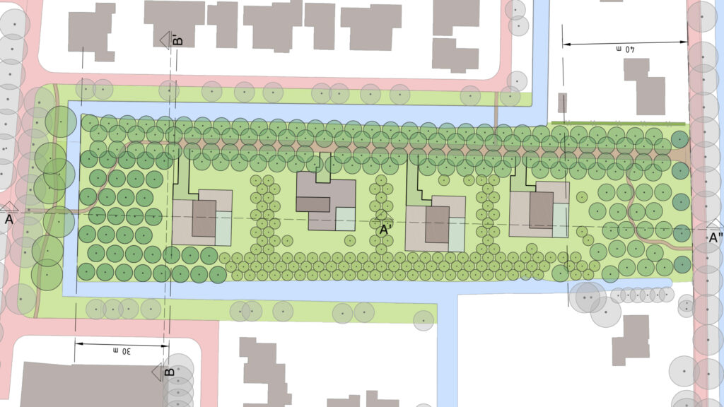 Een dubbele van diverse fruitsoorten laan vormt de hoofdstructuur van de nieuwe boomgaardtuin. Rond de woningen staan in een rasterpatroon groepsgewijs diverse soorten hoog- en laagstambomen. Enkele perenbomen verkeren nog in goede staat en worden opgenomen in het nieuwe rasterpatroon. De woningen worden minimalistisch vormgegeven en komen als losse objecten in de boomgaard te staan. De boomgaard wordt gezamenlijk eigendom en openbaar toegankelijk. Door middel van voetgangersbruggen worden verbindingen gelegd naar de omliggende wijk.