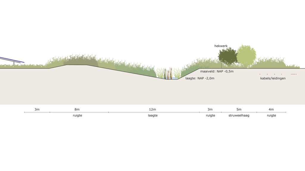 Het zonneveld wordt een ecologisch interessant gebied in het veenweidelandschap. Het terrein wordt ingezaaid met een kruidenrijk grasmengsel en de oevers worden extensiever beheerd. Er worden verhogingen en verlagingen gegraven, waardoor zich een diverse beplanting zal ontwikkelen. De bestaande sloten en oevers blijven intact en worden voor zover mogelijk extensiever beheerd. Een gemaaid graspad geeft omwonenden toegang tot de natuurlijke rand van het veld.