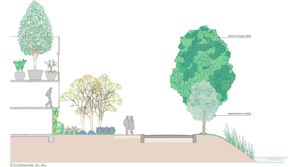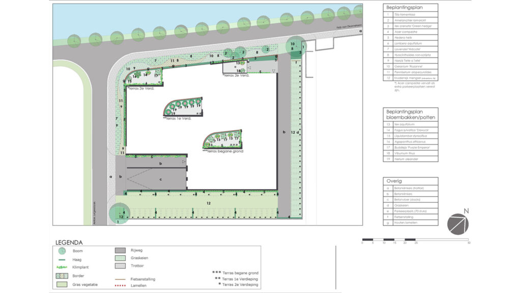 In het landschaps- en beplantingsplan sluit het gebouw aan op de kleinschaligheid van de nabij gelegen woonwijk en zet tegelijk in op duurzaamheid, biodiversiteit en het beperken van hittestress. Het terrein krijgt en groene inrichting met graskeien en grasstroken met kruidenrijke vegetatie om te parkeren. Er komen lindebomen op de hoeken, hulsthagen langs de gevels en parkeervakken en bloemrijke borders. De entree is ingericht met een mix van verschillende bloeiende vaste planten, siergrassen en krentenboompjes. De gevels van het gebouw worden deels begroeid met klimop en worden voorzien van vleermuiskasten en zwaluwnestkasten. De terrassen en balkons zijn ingericht met bomen en potten met bloeiende vaste planten. Op het terrein wordt een groen geheel die de uitstraling van het gebouw en de biodiversiteit versterken.