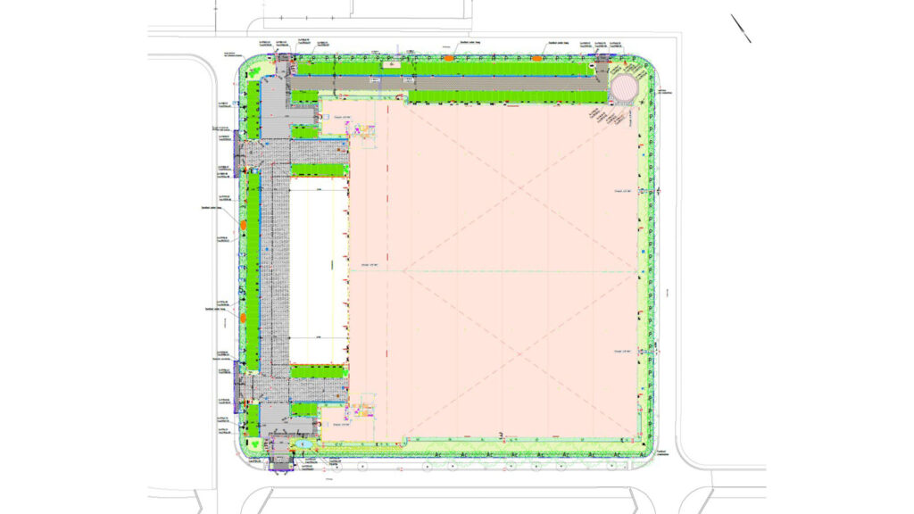 Het terrein is functioneel ingericht met de hoofdentree voor personenauto’s aan de Voltaweg en voor vrachtwagens zit de ingang aan de Andersonweg, aan deze zijde zijn ook de loadboxen en parkeervoorzieningen gesitueerd. Voor een goede doorstroom op het terrein is er voor de vrachtwagens een aparte in- en uitgang gecreëerd om te zorgen voor een richtingsverkeer. De voorgevel heeft een formele uitstraling die wordt versterkt door lange rijen ramen en bloembakken met kleurrijke beplanting. Een brede haagbeukhaag rondom het perceel zorgt voor samenhang en geeft het terrein een groen karakter. De keuze voor populierenrijen is gebaseerd op de rationele verkaveling en de kenmerkende lijnen van het oorspronkelijke landschap van deze plek. deparkeerplaatsen zijn voorzien van grasbetontegels die zorgen voor een goede waterinfiltratie. De houten fietsenstallingen bij de kantoorentrees sluiten aan bij het gebruik van natuurlijke materialen. De gekozen beplanting, insectenhotels en nestkasten creëren bovendien leefruimte voor vogels en insecten, zo draagt het terrein bij aan de biodiversiteit en landschappelijke kwaliteit.