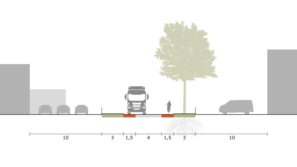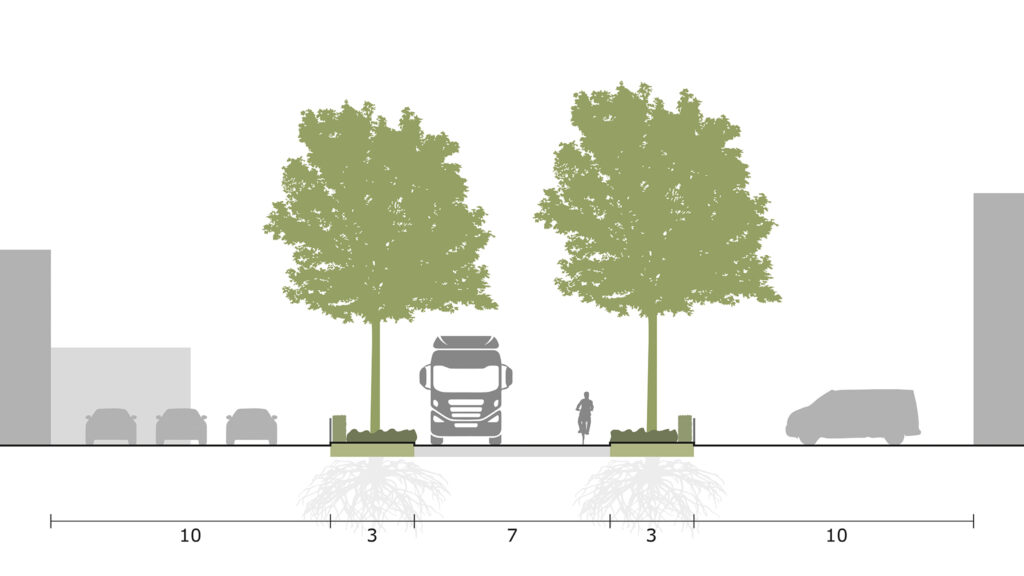 Er worden concrete maatregelen voorgesteld om de uitstraling en de verkeersveiligheid op korte termijn te verbeteren. De groenstructuur kan nieuw leven worden ingeblazen door de aanplant van laanbomen, bloemrijke borders en een biodiverse vegetatie langs de randen. De verkeersveiligheid kan worden verbeterd door vrachtverkeer en fietsers beter van elkaar te scheiden.