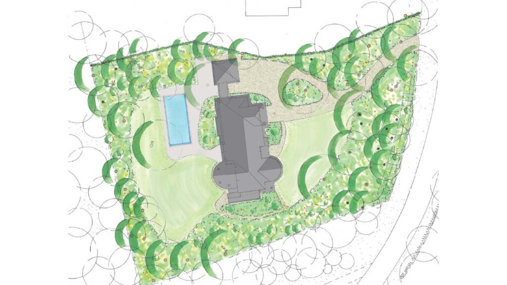 Op het perceel Raboes 14a in Laren is de realisatie van een nieuwe woning gewenst, inclusief een zwembad en bijgebouwen. Voor deze ontwikkeling is volgens het geldende bestemmingsplan een voorstel voor de landschappelijke inpassing vereist. Landschappartners heeft van de familie J. Odekerken de opdracht gekregen om dit plan uit te werken. Het perceel ligt in het bosgebied van de Utrechtse Heuvelrug, aan de westelijke dorpsrand van Laren. De nieuwe woning krijgt een karakteristieke Larense architectuur en wordt gesitueerd op het hogere deel van het terrein, op enige afstand van de weg, in aansluiting op de omliggende bebouwing. De huidige open ruimte rondom de woning bestaat grotendeels uit gras, met aan de oost- en westzijde hoge bomen tot circa 25 meter. Het betreft zowel naaldbomen, zoals douglasspar, westerse hemlock en Europese lariks, als loofbomen zoals eiken, beuken en tamme kastanjes. In de landschappelijke inpassing worden deze open ruimte in het bos versterkt en verdeeld in een voor- en achtertuin. De woning komt markant te liggen in de open ruimte. De voortuin vormt de entree met een slingerend grindpad, omgeven door bomen en struiken die de villa landschappelijk inkaderen. De achtertuin biedt rust en privacy, met een terras en een zwembad. Daarbij blijven zichtlijnen naar het omliggende bos behouden, terwijl hagen, struiken en nieuwe aanplant zorgen voor afscherming en aansluiting bij het boskarakter.